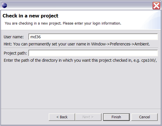 - The next time you check your project in, you will no longer have to enter a user name and will be able to simply press Finish on the first wizard page.