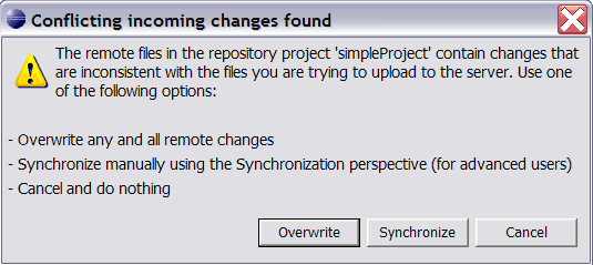 If somebody else had checked code in it is important that you do not overwrite the changes they have made. The best way of dealing with that problem is to manually synchronize all of the files that are in conflict. You can do this in the Synchronization perspective in Eclipse, which will display all the files that are in conflict and allow you to examine the differences line by line. To synchronize the files, you should first download all of the remote changes into your workspace, resolve any errors and make sure the application still runs without trouble, and then check the updated files in. Please read the documentation in Eclipse about synchronizing files.