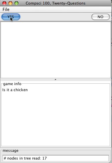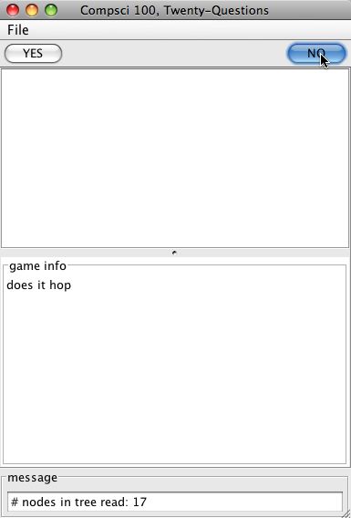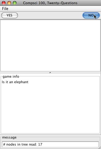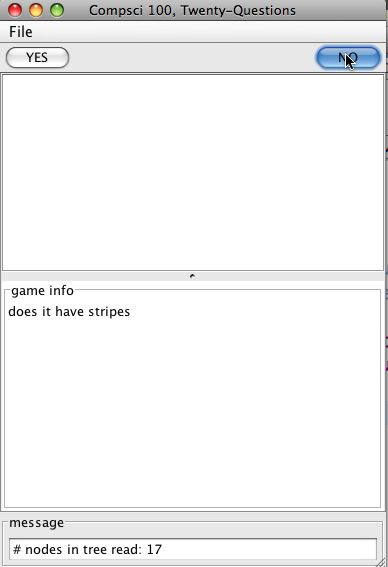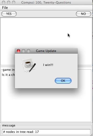 - Steps 3 and 4 repeat until the computer guesses correctly, or until the computer runs out of game tree without guessing correctly. If the computer won, it should send a victory message to the view using the showDialog method. If it lost, things are more complicated: see below.