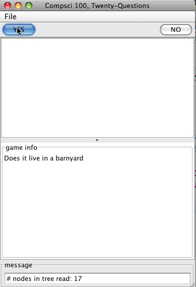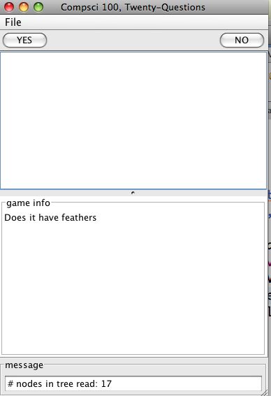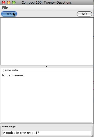 StringBuilder sb = new StringBuffer(); sb.append("Is it a walrus?\n"); // Note the use of "\n" for a newline! myView.update(sb.toString()); - The player clicks YES or NO. The view calls the model's processYesNo with the appropriate value. The model updates its internal game state (myCurrentNode, plus anything else you add) according to what the player said.
