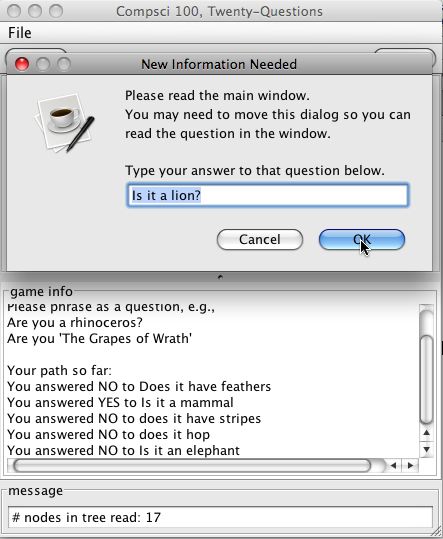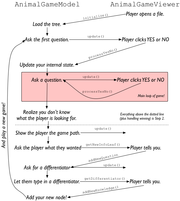 Request new info from player - Now, the tricky part. The user types in their question ("Is it a lion?"), and clicks OK. When they do this, the view (which handled the mouse click) calls the model's addNewQuestion method with the typed-in String as an argument. From the model's point of view (that is, your point of view), this looks slightly strange: you call a view method from one place in your code (where you call getNewInfoLeaf), and you get the answer back somewhere else (as an argument to addNewQuestion). It looks like you've jumped from one method to another; that's because the view has jumped you there! Handling this correctly means storing some extra state in your model just before you call getNewInfoLeaf, so that you can use that state in addNewQuestion.