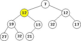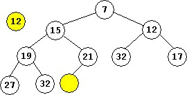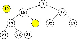 - Suppose new values are added to the last heap above (with 10 elements, the root is 7 that has both children with the value 12).